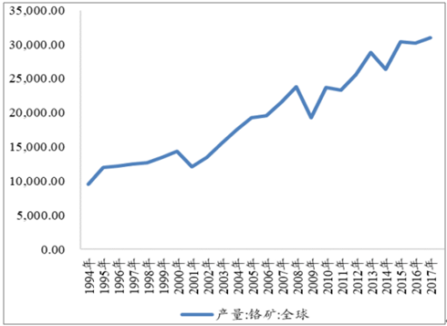 全球鉻礦產(chǎn)量變化(千公噸)