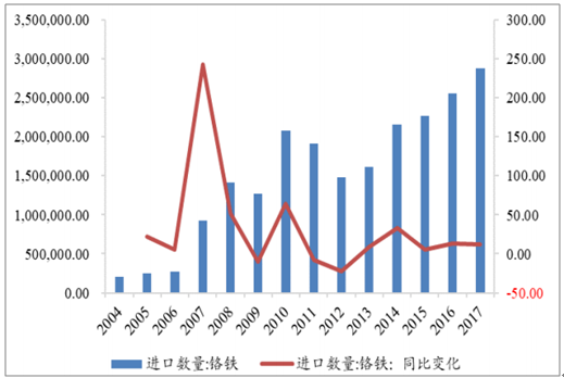 2004-2017年我國鉻鐵進口數(shù)量(噸)及其同比變化(%)