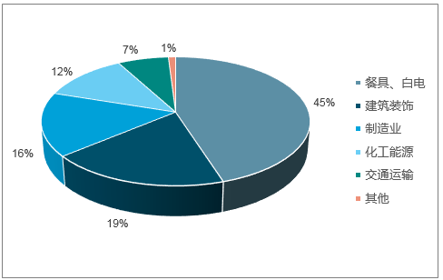 餐具、白電領(lǐng)域不銹鋼消費占比約45%,建筑裝飾19%、制造業(yè)16%、化工能源12%、交通運輸約7%。