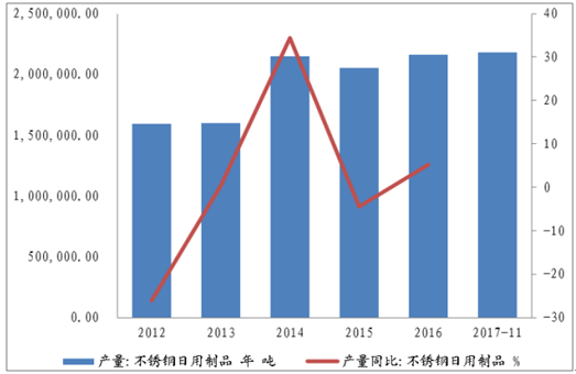 2015-2017年的產(chǎn)量可由不銹鋼日用品產(chǎn)量側(cè)面反映,在此期間,不銹鋼日用品產(chǎn)量穩(wěn)定增長,2016年不銹鋼日用品產(chǎn)量216.09萬噸,同比增長5.23%,截至2017年11月,不銹鋼日用品產(chǎn)量已達(dá)217.83萬噸,預(yù)計2017年將穩(wěn)速增長。